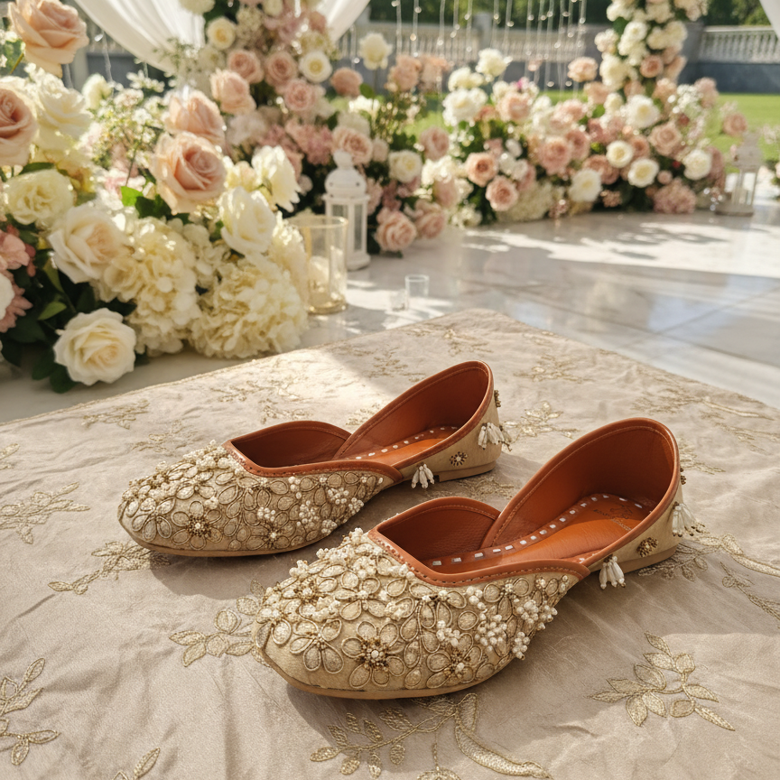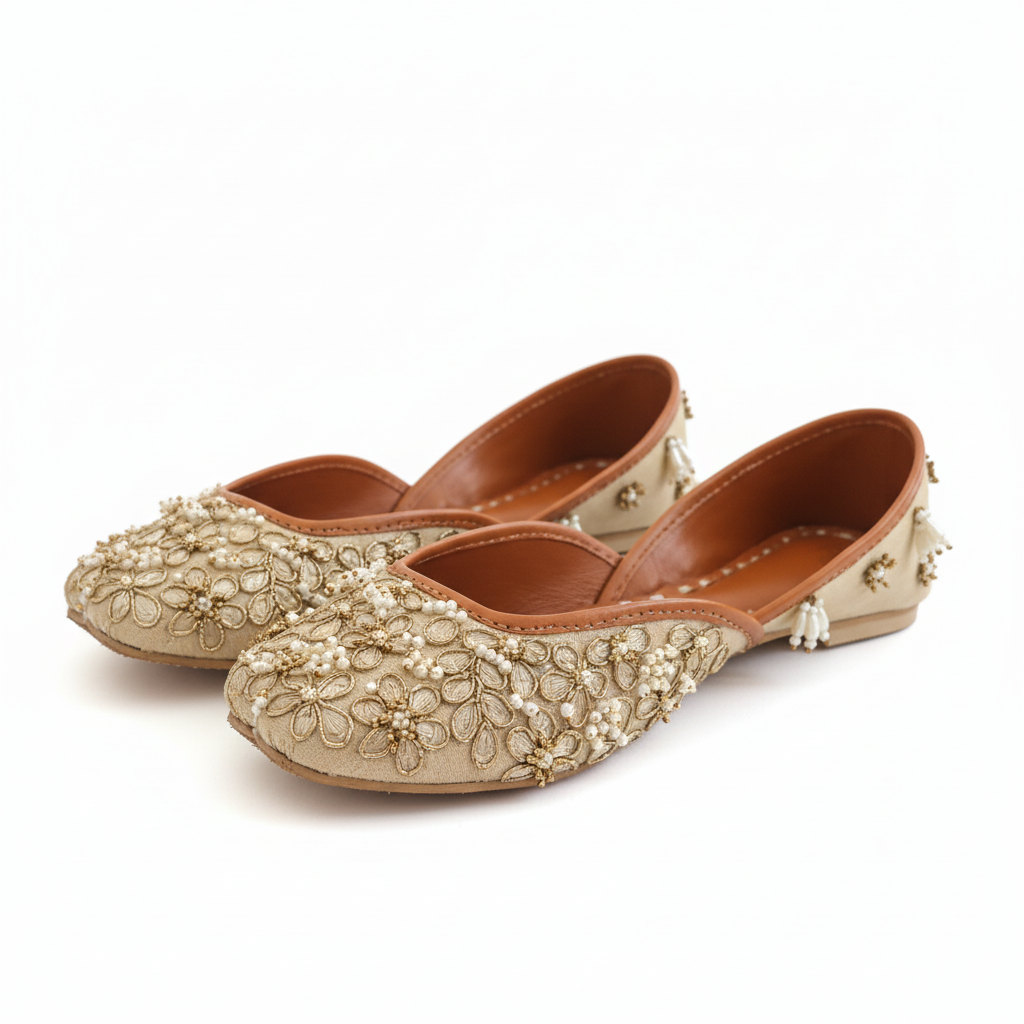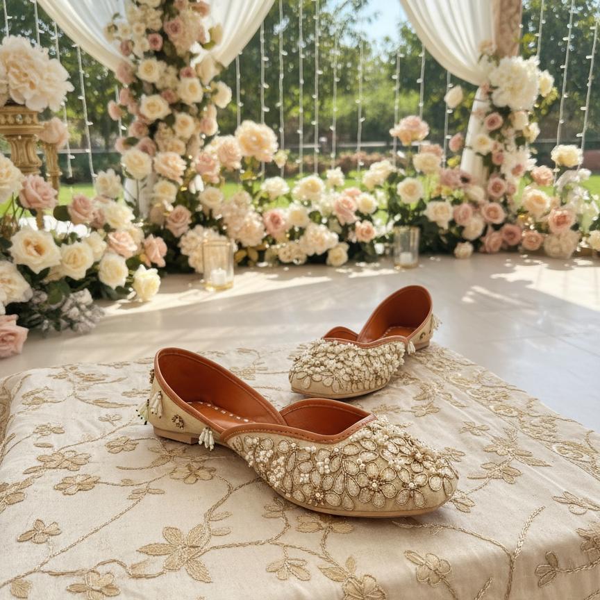 Radiant, elegant, and effortlessly graceful, Gotta Get Down is the perfect blend of tradition and modern charm. This jutti celebrates the soft allure of cream fabric, brought to life with intricate gotta embroidery and delicate pearl drops that shimmer with every step.