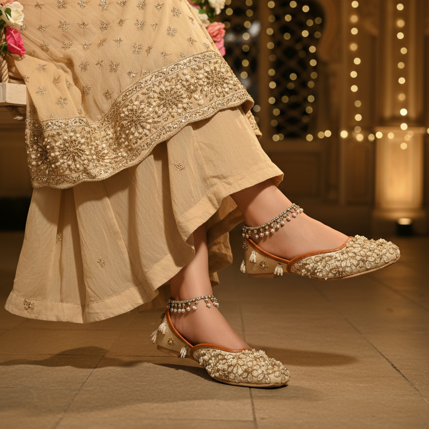 • Upper: Cream fabric adorned with intricate gotta embroidery and elegant pearl drop embellishments.