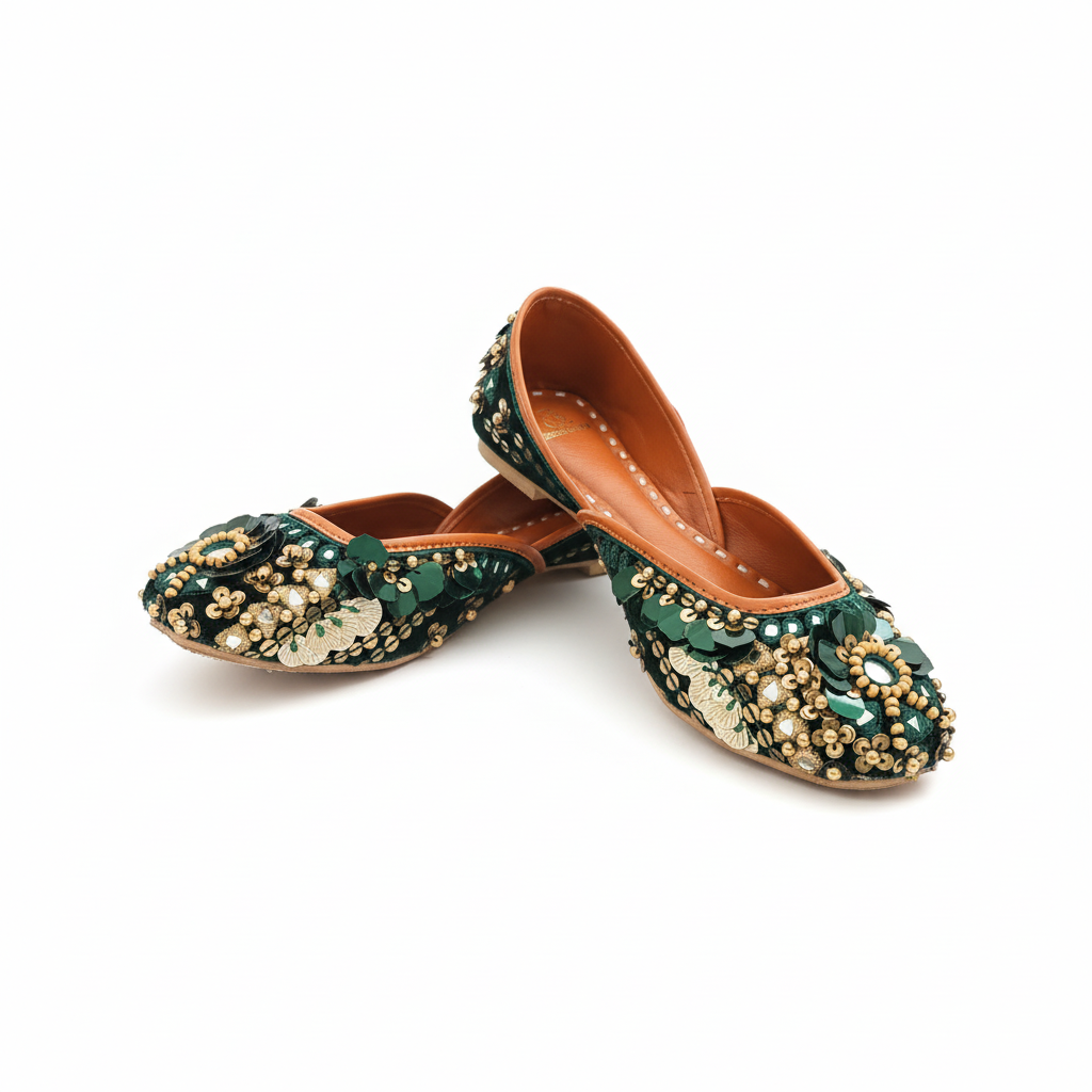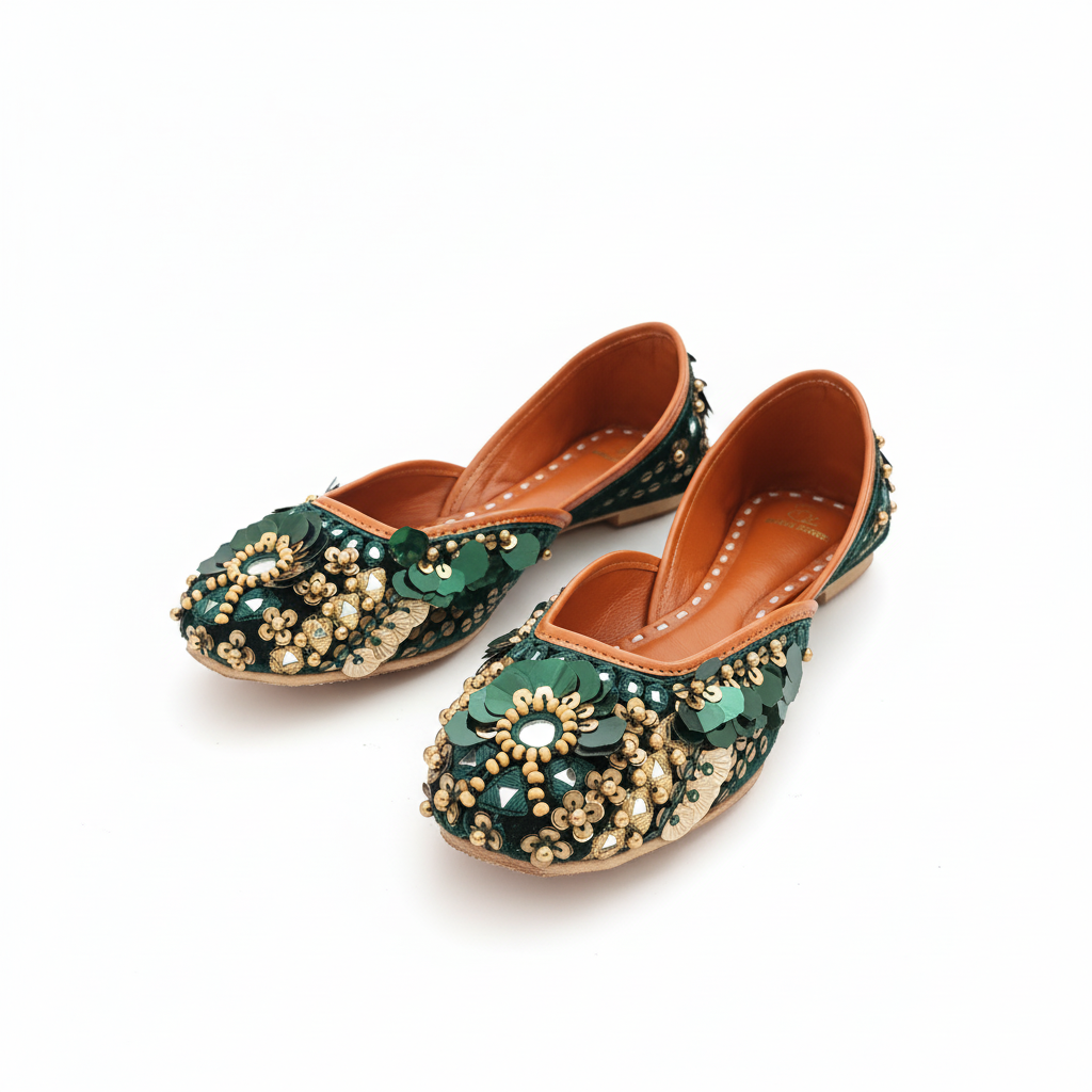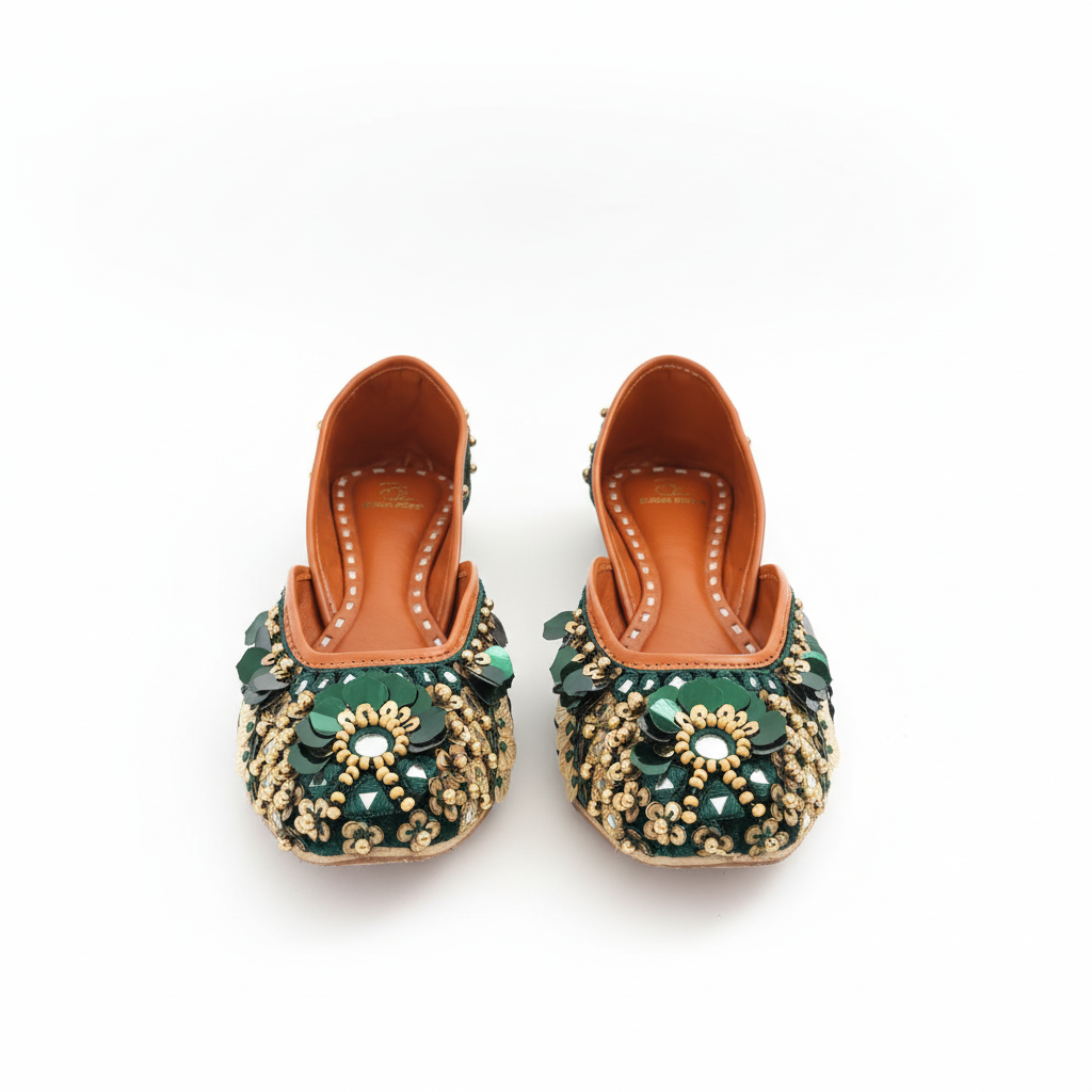 Get ready to steal the spotlight with Mehndi Mayhem, the jutti that’s all about festive flair and fabulous vibes. Wrapped in rich emerald velvet and sprinkled with golden beads and dazzling florals, these beauties shout celebration with every step you take. It’s like wearing a party on your feet - bold, bright, and impossible to ignore!