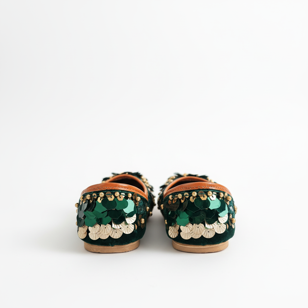 • Upper: Plush emerald velvet decked out in golden beads, sequins, and floral fun.