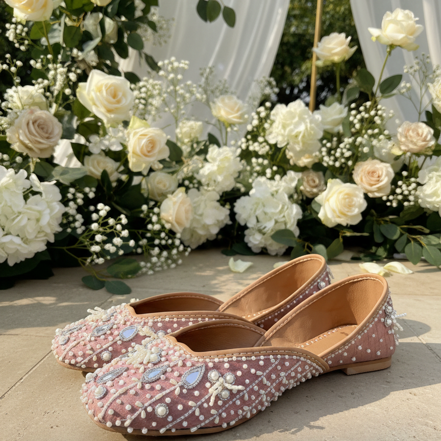 Delicate, dreamy, and effortlessly graceful, Pixiedust is a handcrafted jutti designed for moments that call for subtle shimmer. Set on a soft blush pink base, this pair glows with hand-embroidered pearls, seed beads, and teardrop mirror accents, arranged in fluid dotted patterns that feel light, airy, and ethereal.