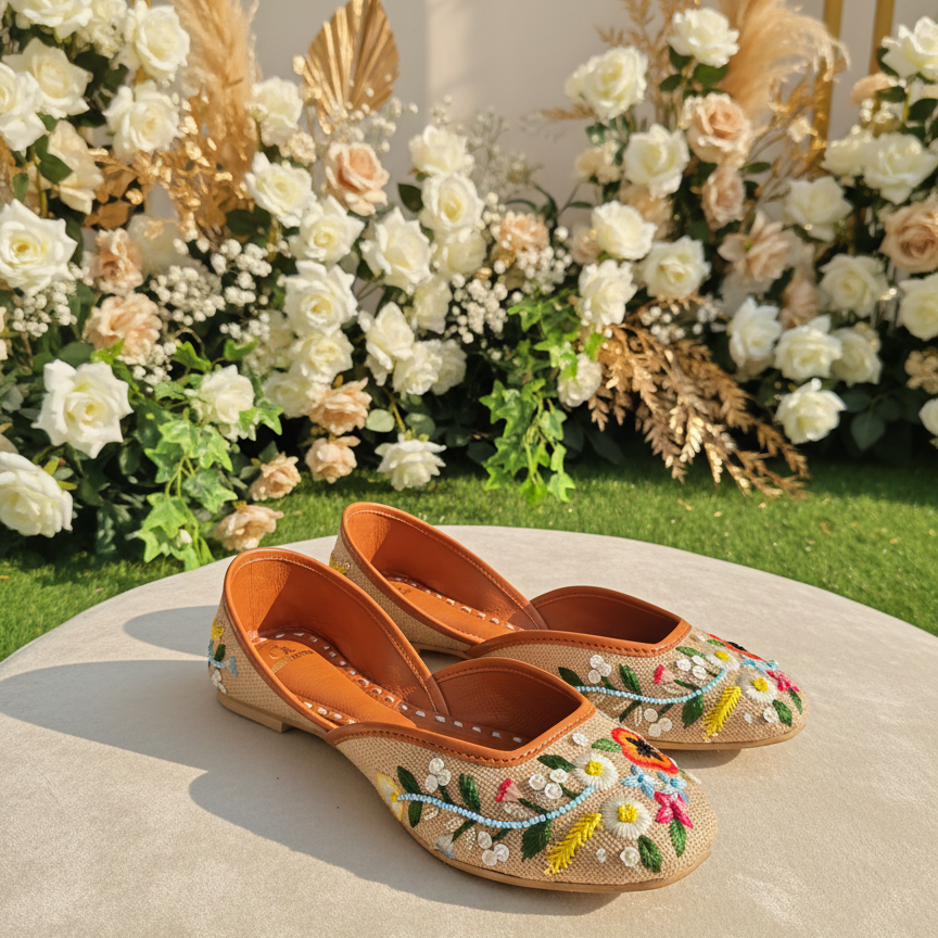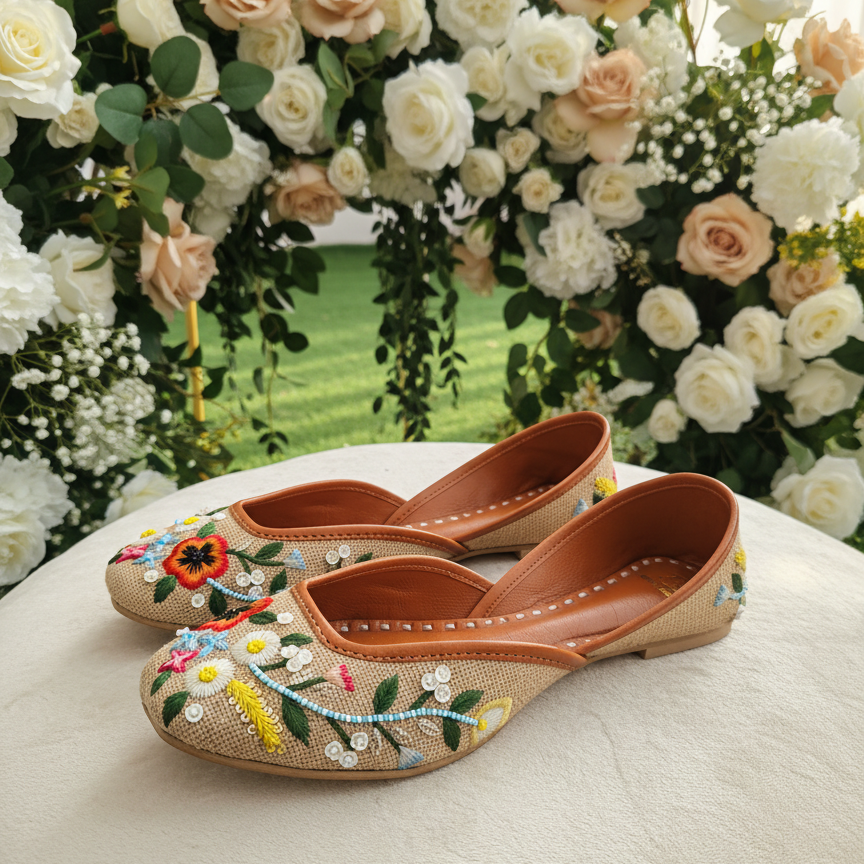 Bask in the joy of endless sunshine with Summer Lovin’, a handcrafted jutti that captures the carefree spirit of the season. Set on a natural jute base, this pair celebrates the charm of summer meadows - bursting with vibrant, hand-embroidered florals that feel as fresh as a field in full bloom. A bold orange-red poppy takes center stage, surrounded by playful white daisies, blue forget-me-nots, and cheerful yellow buds. Along the edges, a hint of icy blue beadwork adds a soft, dewy sparkle, like morning light on wild petals.
