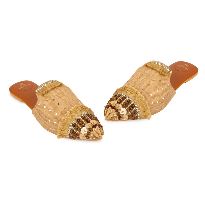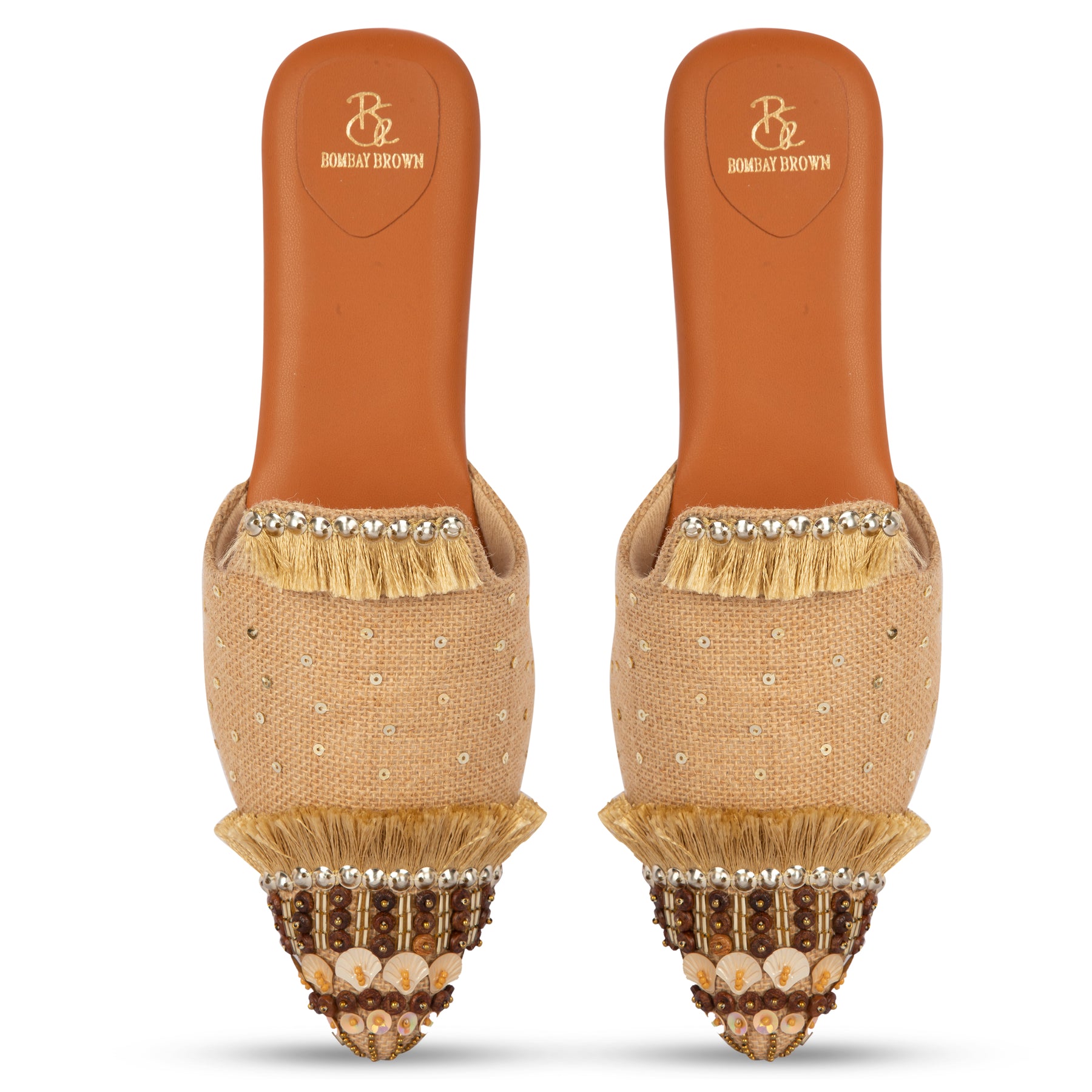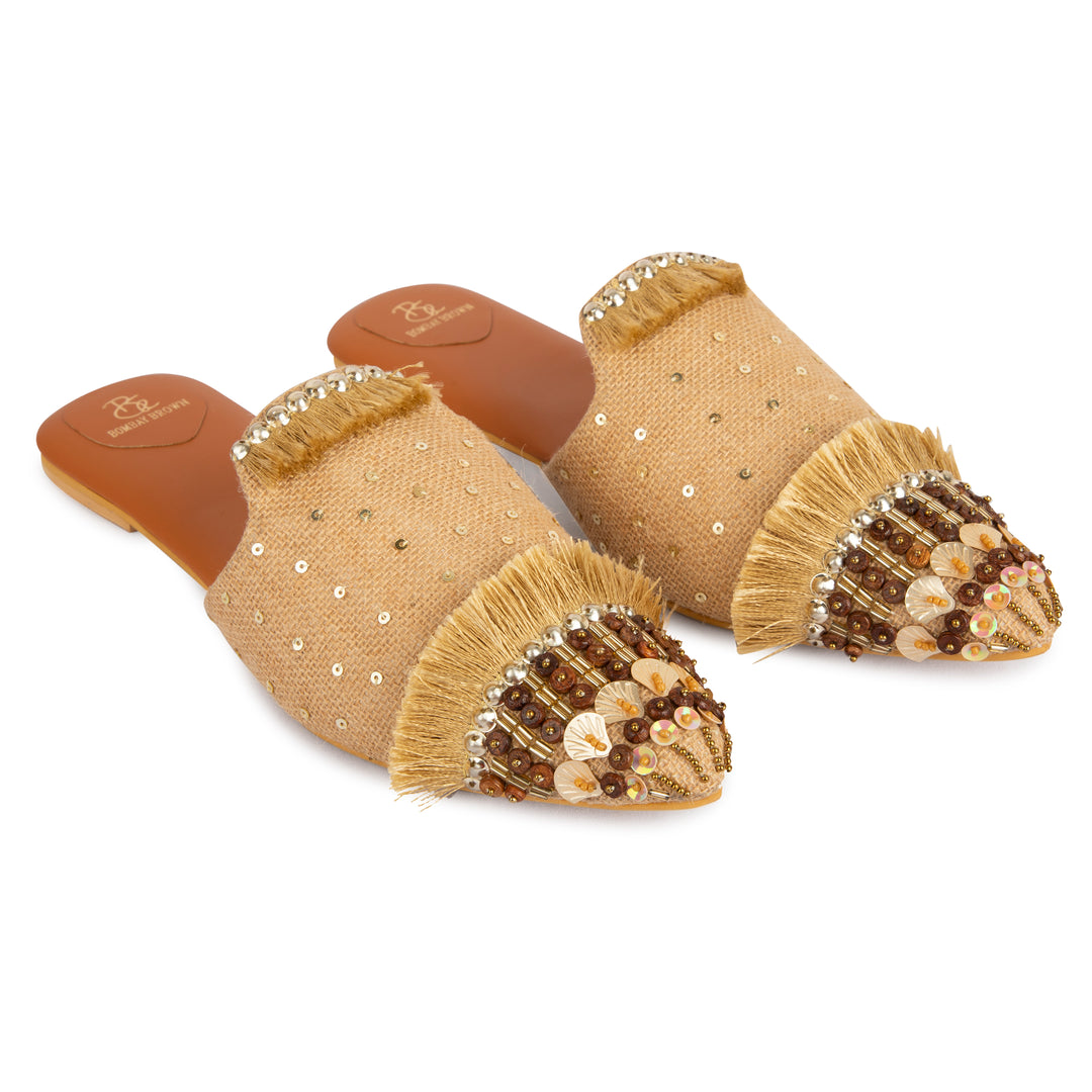 In this pair we have used super cute flat wooden beads with gold accents in the form of fringes, pipes and shells with a spread out golden sequin work. The bottom of mules is seamless in tan color with cushioning for added comfort. A bohemian mix in true sense these mules will pair well with all kinds of looks.